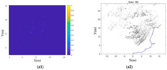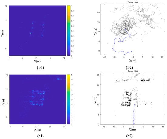 For scenario one, the radar circled three cars. The map and trajectory generated by method one are shown in Figure 13(a1 and a2). The map and trajectory generated by method three are shown in Figure 13(c1 and c2). The maps generated by the three methods corresponded to different physical quantities. A1 corresponded to the RCS of the target, b1 corresponded to the echo power of the target, and c1 corresponded to the existence probability of the target. Dark blue corresponded to the minimum physical quantity, and light yellow corresponded to the maximum physical quantity. In a2–c2, the blue line was the radar track, and the black point was the radar point cloud.