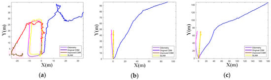 First, we compared the trajectories, as shown in Figure 14. The three pictures a, b, and c corresponded to three experimental scenes. In each scene, the trajectory generated by Odometry, the trajectory generated by the original CSM, the trajectory generated by the improved CSM, and the trajectory generated by the entire SLAM were compared. The trajectory of Odometry was generated from the original data of Odometry. When generating the trajectories of the original CSM and the improved CSM, in order to simply compared the quality of the point cloud matching method, Odometry information was not used. Therefore, no “Multi-scan” was constructed, and DBSCAN was not used to filter out outliers. The trajectory of SLAM was generated by the SLAM proposed in this paper. It underwent a complete data preprocessing link and used an improved CSM as a point cloud matching method.