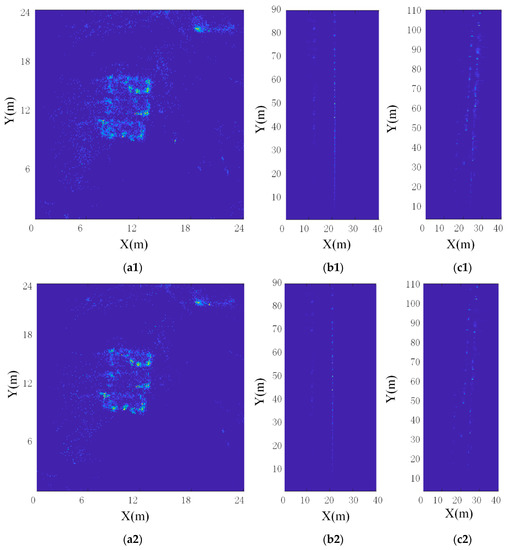 Using DBSCAN with RCS feature to identify the outliers in a2–c2, the result was as a3–c3, the red points in the figure were the identified outliers, and the blue points were the reserved point cloud. After the outliers were removed, the result was shown in Figure 11(a4–c4). We can observe the two straight lines in b4 and c4, which corresponded to the guardrail and the parked car in Figure 10b. The two straight lines in c4 corresponded to the cars parked on both sides of the road in Figure 10c. Comparing b4, c4 and b2, c2, it can be seen that the geometric outline of the environment became clearer. So, we know that most of the outliers were indeed effectively screened out. Comparing a4 and a2, the change was not obvious, because scene 1 itself was empty. The environment itself provided very little geometric information, so the point cloud detected by radar was also reduced. The experimental results in this part verified the effectiveness of using DBSCAN to screen out outliers.