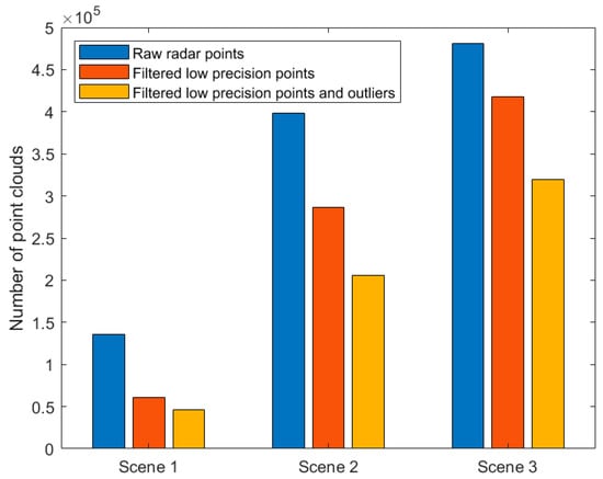 In this section, we analyzed the amount of data carried by SLAM. Because the millimeter-wave radar SLAM proposed in this paper eliminated low-precision points and outliers in the data preprocessing step, it greatly reduced the amount of calculation and storage of the computer. In the three experiments, this paper separately counted the number of original point clouds, the number of point clouds after filtering out low-precision points, and the number of point clouds after filtering out low-precision points and outliers, as shown in Figure 16.