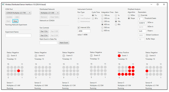 During live monitoring, each new data point is placed into the Snap and Active sliding windows, and all other points are shifted back one place. The oldest data point in the active window moves to the Background window, and the oldest data point in the Background window is dropped. Tests are performed for each indicator, and positive indicators are determined as previously described (above) [7]. A diagram of the fifteen indicators on the GUI provides information on positive indicators in red (Figure 3). This provides specific information to the user regarding which indicators have been triggered. If a sufficient number of positive indicators are observed, the status of the entire sensor will indicate “positive”. Other device status indicators are: “cooldown”, “extended”, and “OFF”. In addition to the graphical display of the current state of each sensor, log files are created and stored with the results of the analysis as it occurs.
