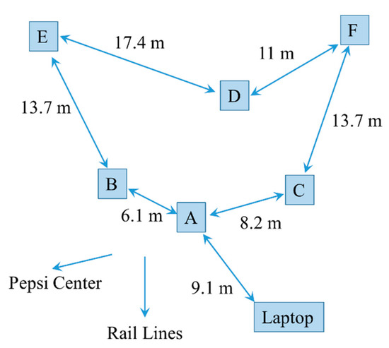 A field demonstration of the ABEAM-15 technology was organized at the Pepsi Center in Denver, CO, USA on 4 October 2019. This is a facility providing between 17,000 and 21,000 seats (depending on configuration) for concerts, sporting events, and special events. Approximately 1 km from the central business district, it occupies 18 ha, including a number of parking lots, and is located in proximity to both commuter and freight rail lines. For this demonstration, six individual ABEAM-15 instruments in housings and two without housings were arranged in a parking lot located 480 m from the arena structure. The housed devices were arranged as shown in Figure 4, approximately 400 m from the rail lines.