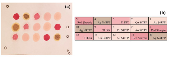 All indicator coupons (Figure 5) incorporated three spots each of four metalloporphyrins, silver meso-tetra(4-aminophenyl) porphyrin (Ag N4TPP), thallium Deuteroporphyrin IX bis ethylene glycol (Tl DIX), and copper (Cu S4TPP) and gold (Au S4TPP) variants of meso-tetra(4-sulfophenyl) porphyrin, and three negative control spots were created using a red Sharpie® marker. Coupons were prepared based on a modification of the previously used protocol [11,20] using Whatman filter paper as the support. Porphyrins were deposited by spotting 5 μL of the porphyrin solution (2 mg/mL) onto the appropriate area of the coupon. Samples were dried at 100 °C before storing in the dark.