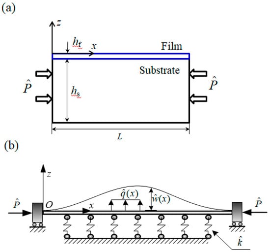 Figure 1a illustrates the thin film with thickness of hf on top of a compliant substrate with thickness of hs subjected to a compressive load and non-conservative force . Buckling occurs after loading because the thickness of the film is extremely small, which is very similar to a slender beam buckling. In the analytical model, the thin film is considered as Euler–Bernoulli beam with fixed condition at both ends, since the thickness of film hf is far less than the length L []. Planes of the cross sections remain planes after deformation, and the plane of the cross section is still perpendicular to the axis after deformation. It is unnecessary to employ the von Karman plate theory to model the film because it leads to lengthy solutions not convenient for practical use due to the in-plane displacement and the shear traction []. A common approximation is to ignore the in-plane displacement and the shear traction [,]. The film deformed out of a plane only can be modeled into a beam, which greatly simplifies theoretical analysis []. The compliant substrate is considered to be a Winkler elastic foundation [,,,], whose reaction at any point is proportional to the deflection, with stiffness and deflection of the thin film shown in Figure 1b, where is the function of Cartesian coordinate , which is along the axial direction of the thin film.