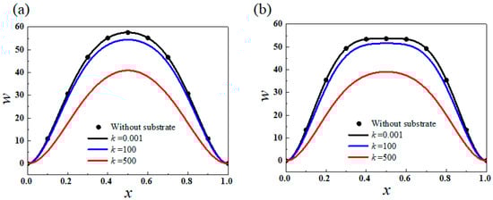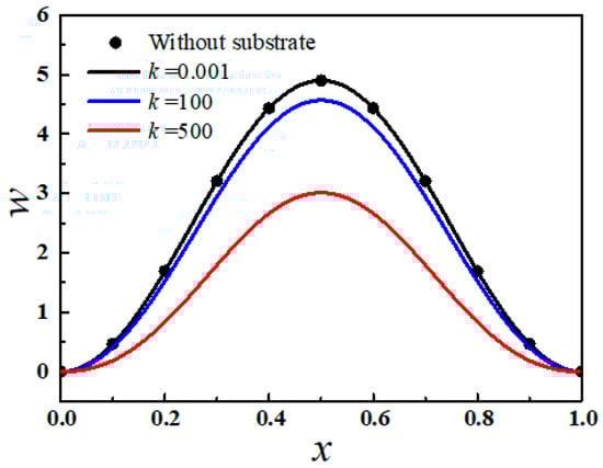 The effective stiffness of substrate k can have significant effects on the buckling behaviors of the thin film. Figure 2 shows the deflection of the first-order buckling mode in the films with different substrate stiffness with normalized pre-stress of 10 × π2. When the pre-stress is chosen as 0.001 very close to zero, the deflection can nearly equal the results obtained without substrate [], which can verify the accuracy of the analytical model in the post-buckling analysis. As substrate stiffness increases, the Young’s modulus of compliant substrate increases, and the deflection of the thin films decreases. When substrate stiffness changes from 0 to 500, the deflection of the film decreases from 4.9 to 3.0.