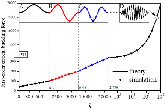 The first-order critical buckling force versus substrate stiffness comparison between theory and simulation when P = 106. The first-order buckling mode with (A) k = 0~877, (B) k = 877~6225, (C) k = 6225~21,750, and (D) when k = 5.5 × 107.