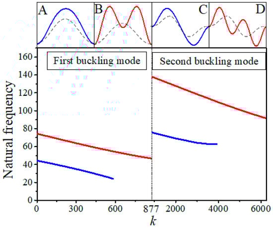 The substrate stiffness can have negative effects on the natural frequencies, which can be found in Figure 5. Blue lines and red lines in the main figure stand for the first and the second order natural frequencies for the system. However, the corresponding buckling modes are shown in the graphs A–D, where A and B show the vibration mode in the first buckling mode; C and D show the vibration modes in the second buckling mode. With increase of k, the first linear natural frequency and the second linear natural frequency both decrease gradually, and the first vibration mode disappears when the first nature frequency decreases to 24.13 below in first buckling mode and decreases to 60.71 below in second buckling mode, because Equation (22) turns into the condition .