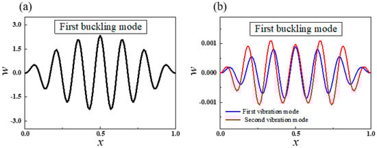 (a) The first order buckling mode and (b) the first order (blue line) and the second order (red line) vibration modes in the first buckling mode with substrate stiffness k = 3.38 × 106 when P = 5000.