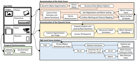 In order to explore heterogeneous data sources in a shared 3D reconstruction, the underlying data needs to be preprocessed. In this section, a detailed overview of the used preprocessing pipeline is provided (see Figure 1). First, all supported input data types and data-specific terms are introduced. Subsequently, the approaches used for static and dynamic scene reconstructions as well as metadata extraction (high-level scene analysis) are explained. The section concludes with the description of the module for temporal synchronization.