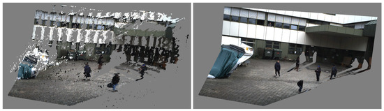 The reconstruction of a dynamic scene, i.e., a sequence of video frames with dynamic content, is a challenging task. In the past, point clouds were typically reconstructed from calibrated and synchronized stereo image pairs or multi-view setups. Disparity maps were computed by exploiting the epipolar stereo geometry. There are different block matching approaches that assign each pixel of the left image to the best matching pixel of the right image along its epipolar line by comparing local image blocks with correlation-based block matching approaches [55,56]. These classical approaches allow an efficient reconstruction of any image structure without having to rely on high-level information of scene content. An example result of a point cloud that has been reconstructed using stereo block matching is shown on the left in Figure 3. The drawback, however, is its inherent dependency on synchronized image pairs from at least two different cameras that overlap. In practice, stereo cameras are not available in most video security applications and cameras are preferably installed in different viewing directions to reduce the total number of cameras and thus hardware costs.