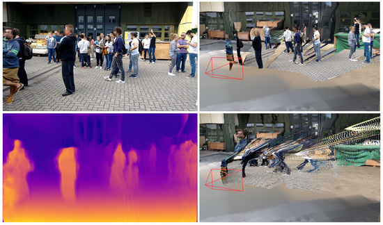 Different approaches are worth to be considered to deal with non-synchronized heterogeneous monocular image data. We focused on approaches that are frame-based and capable of obtaining a depth map, point cloud, or other high-level representation for each frame independently of other frames. This enables high parallelization and thus fast processing. In recent years, monocular depth estimation using neural networks grew in popularity. Several methods like Monodepth2 [57], monoResMatch [58], and a self-monitored monocular depth estimation approach by Hermann [59] were considered. An exemplary result of Monodepth2 with a pretrained model based on the KITTI dataset [60] is shown in the bottom line of Figure 4. While the results of these approaches look impressive from a scientific point of view, these point clouds did not meet the requirements for the application, as they were still too noisy or stretched. These artifacts become particularly visible when the perspective of the observing camera on the point cloud is changed. Even the slightest variation in depth on the surface of a human body makes it difficult to identify the person in the scene. This does not mean, however, that these approaches are not suitable in general. Recent work that explicitly dealt with monocular depth estimation, for instance, with focus on videos with humans [61] or for obstacle detection in autonomous cars [62], showed that monocular depth estimation from neural networks could be a promising technique in the future.