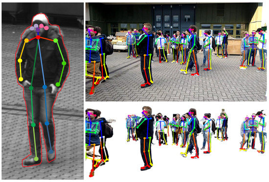 A skeleton extraction module increases the stability of the procedure for detected persons. The neural network-based approach OpenPose allows to obtain 2D key point locations of a person [63]. These key points include body parts such as feet, shoulders, elbows, hands, head, nose, and ears, as shown in Figure 6. An advantage of this approach is that it is possible to obtain high-level information about a person’s body, even if the person is partly occluded, e.g., by another person or object. A person’s skeleton information is used to improve the depth estimation for the corresponding image segment. The framework assumes that a person is on average 1.70 meters tall and that the feet always touch the ground. Handstands, jumps, or other artistic postures are currently not supported by our approach. However, in most cases of visual surveillance this is not a major limitation. The 3D location of a person is calculated by casting a ray that intersects the pixel position of the foot with the 3D surface model, provided that the camera position and the intrinsic camera parameters are known. In case the location of the foot could not be restored, other known key point locations are used and an estimated offset is added. Thus, if the segmentation algorithm only returns, for example, the upper body of a person due to occlusion, the extracted skeleton key points indicate this circumstance. The 3D location of the segment is then calculated taking into account that the entire person is actually larger than the extracted segment, resulting in a more accurate 3D position.
