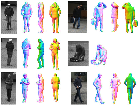 - Saito, S.; Simon, T.; Saragih, J.; Joo, H. PIFuHD: Multi-Level Pixel-Aligned Implicit Function for High-Resolution 3D Human Digitization. In Proceedings of the IEEE Conference on Computer Vision and Pattern Recognition (CVPR), Online, 14–19 June 2020. [Google Scholar]