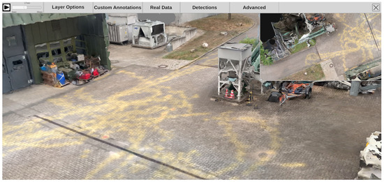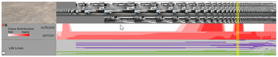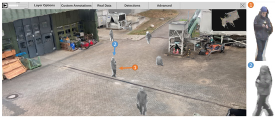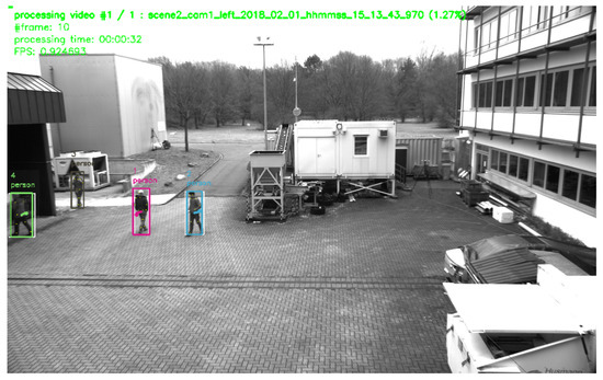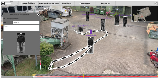 After starting the main application, the system checks whether feature preprocessing has been performed beforehand. If not, the preprocessing sequence will be started and each time-dependent video is processed in an object detection pipeline. The pipeline for the high level scene analysis (see Figure 1) has a modular structure. This way, the entire pipeline or parts of it can be replaced by other modules that deliver an output using the same format. Figure 8 shows a frame from the feature extraction preprocessing step. During preprocessing, the video is played back and all recognized objects and persons are highlighted by colored rectangles, including their respective path of movement.