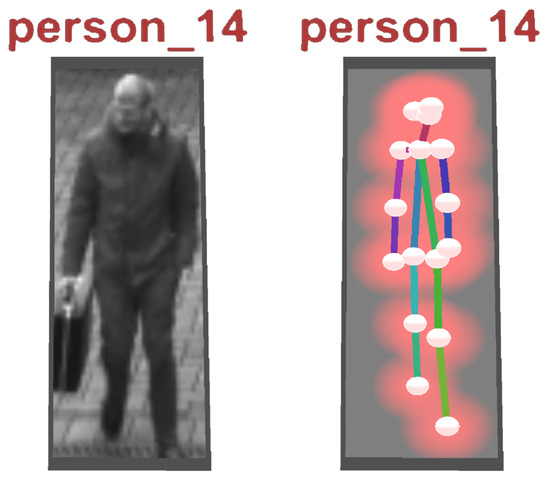 As a first step in the feature extraction pipeline, each video from the input pool is processed in an object detection module (convolutional neural network (CNN)) that extracts all detected entities (persons and objects) for each frame of the video. In the present case, the YOLO v3 library (https://pjreddie.com/darknet/yolo/) is applied. The network was used pretrained on the mscoco dataset [52]. The result is a set of independent Detections for each frame, each containing information about its location in the image space (bounding box), a confidence score, and a classification of the object type (e.g., car, person, and backpack). In a second feature extraction step, each detection classified as “person” is processed in a skeleton extraction module by using the mentioned bounding box coordinates of the detection as input parameter. The current status of the proposed framework includes the OpenPose skeleton extraction library (https://github.com/CMU-Perceptual-Computing-Lab/openpose). Similar to the YOLO module, the OpenPose network was used pretrained on the mscoco dataset [52]. With that, each detection of the class “person” is enriched with skeleton information representing the key points of the detected skeleton. Figure 9 depicts a skeleton (right) as shown later in the exploration framework for the detection of a person (left). Subsequently, for each video, all detections are processed in a re-identification module, comparing the detections from different frames and identifying all detections that belong to the same entity (Track). The current implementation exploits DeepSort (https://github.com/Qidian213/deep_sort_yolov3), which reuses features from the object detection module (YOLO v3). As a result, a set of tracks is available for each video, each of which containing detections from the same entity (e.g., person and car) that describes its spatial movement over time. For each track, a representative detection is selected in which the entity is optimally represented (Best Shot). Currently, the detection with the highest confidence (YOLO output) is selected as best shot. Last, a global re-identification module is used to find relations between tracks of different videos. The detection features from the object detection module are used to compare the tracks of different videos and form sets of tracks that belong to the same entity.