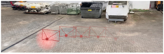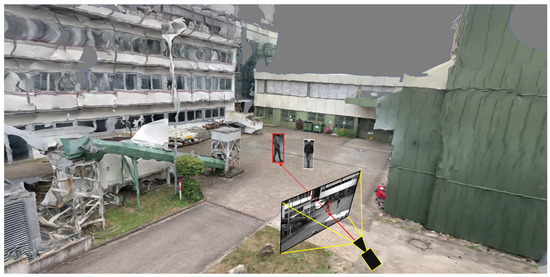 As depth maps may be noisy and thus lead to faulty 3D localizations of detections, we provide an alternative strategy based on the 3D mesh created in the scene reconstruction step (see Section 3.2). Raycasting is applied to calculate the 3D position of a detection. As shown in Figure 10, originating from the estimated camera coordinates (Section 3.2), a ray (red line) is emitted through the bottom center of the detection in the image. The intersection point of the line with the geo-registered mesh is then used as the 3D position of the detection. To determine the angle of the ray, the estimated camera intrinsic properties (focal length and lens distortion) are used in combination with the camera space pixel coordinates of the detection. This approach is based on the assumption that objects must reside at the ground. With objects that are not at the ground, this strategy is, of course, prone to errors. For instance, if a person jumps, then this approach would calculate a wrong position for the time span during the jump, which is farther away from the camera than it is actually the case. To mitigate such inaccuracies in the future, it might be helpful to consider the position and direction of object shadows [66]. Unfortunately, such shadow algorithms depend heavily on lighting conditions. The consideration of shadow effects will therefore probably not eliminate all existing problems of this position extraction task.