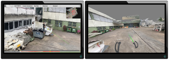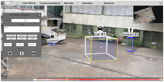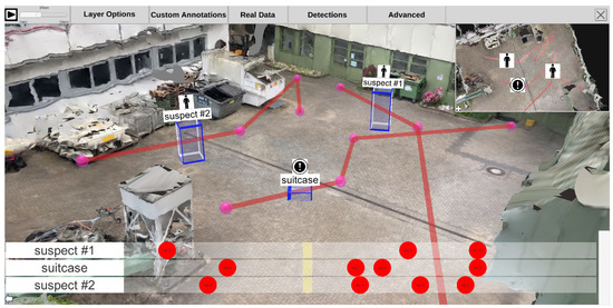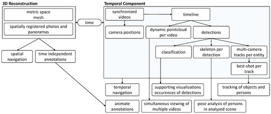 After completing the preprocessing pipeline, analysts can inspect and examine the reconstructed scene using an interactive application. Figure 11 depicts the main building blocks of the analysis application. On the left is the 3D reconstruction, including a static mesh of the given environment and spatially registered time-independent materials such as photos and panoramas. This environment can be spatially explored and enriched with annotations, even if no time-dependent materials were added to the analysis. On the right are all time-dependent materials, such as cameras with estimated locations in space per timestamp, dynamic point clouds, and extracted meta information. We provide a video to demonstrate an exemplary visual exploration of a 4D reconstruction (https://www.youtube.com/watch?v=bcDrLCaI2RI). In the following, most examples are taken from a 4D reconstruction based on the dataset provided by Pollok [68]. The dataset includes several scenes in which several persons, cars, suitcases, etc. are visible and actors reenact different scenarios (e.g., kidnapping and dropping suitcases). It contains video material from three static surveillance cameras as well as footage from handheld devices monitoring the reenacted incident.