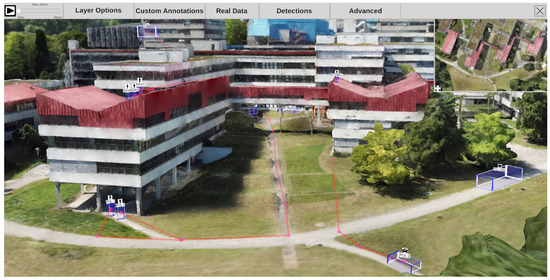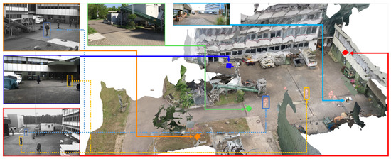 Figure 12 gives a first impression of the benefit of the presented approach. The static 3D reconstruction serves as a base visualization in which all input sources can be placed within a shared context. Static elements such as photos (green) and panoramic images (teal), which provide additional contextual information about the environment, can be spatially registered. Their positions are indicated as camera icons or spheres. Video sources are also spatially registered and visualized as camera icons (orange, blue, and red). This visualization gives the user a good overview of all available input sources and their spatial distribution. It allows the user to relate sources to each other and, for example, find all cameras directed to a certain point of interest. Last but not least, the video footage is temporally synchronized and automatically extracted meta information from all sources can be displayed simultaneously. Blue and yellow dashed lines mark skeletons of detected persons, which were found in different videos. In the following, the building blocks of the demonstrator are described in more detail.