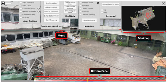 The ISRA-4D interface for the visual exploration of the 4D reconstruction comprises four main parts. As shown in Figure 13, the view of the reconstruction (center) is surrounded by three panels: a menu bar at the top, a mini-map in the top right corner, and a timeline panel at the bottom.