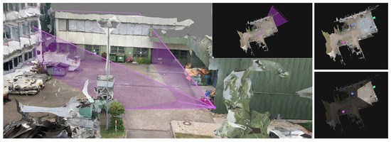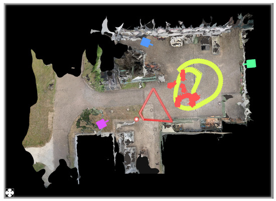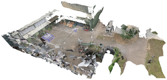 Once the sparse reconstruction is completed, a dense reconstruction is started. In this phase, a multi-view stereo (MVS) reconstruction is performed by employing OpenMVS, resulting in a textured surface model of the scene [54]. The surface model and camera locations resulting from the SfM and MVS pipeline are usually not metrically scaled or georegistered. However, in order to be able to measure the distances between individual points in the scene or to obtain the geolocation of a selected 3D point, absolute scaling or georegistration must be performed (see Figure 2).