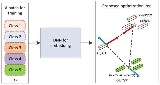 For solving the problem, the main part of the method we proposed is a feature optimizer, which is trained with a new loss function. We measure the distance between each sample to the class center instead of exhausting all triplets, which will save plenty of training time. It will make model training easier in multiclass classification tasks. The feature optimizer is aimed at making the feature more discriminative by reducing intra-class distance and increasing inter-class distance as illustrated in Figure 2.