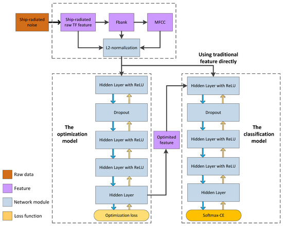 where y is the excepted output, y = {0, 1}, a is the actual output between 0 and 1, n corresponded to each unit in output layer and N is the number of units. We attribute the benefit brought by softmax loss to the fact that the parametric centers of feature optimization are randomly initialized and updated based on the minibatches instead of the whole datasets which might by tricky, while softmax loss would be benefited from seeking better class centers. The whole joint training structure is shown in Figure 3. The left side of the diagram is an optimization model and the right side of the diagram represents a classification model that uses different features. The top of the diagram is the extraction process of traditional features, such as raw ship-radiated spectral feature, Fbank and MFCC. All of these feature will be compared in experiments in Section 4. It is worth mentioning that L2-normalization is adopted in the spectral feature for reducing the difference between different frames in the same recording audio.
