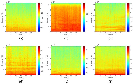 Spectrogram of hydrophone signal for parts of ships. (a) background noise; (b) motorboats; (c) passenger ferries; (d) dredger; (e) mussel boats; (f) ro-ro vessels.