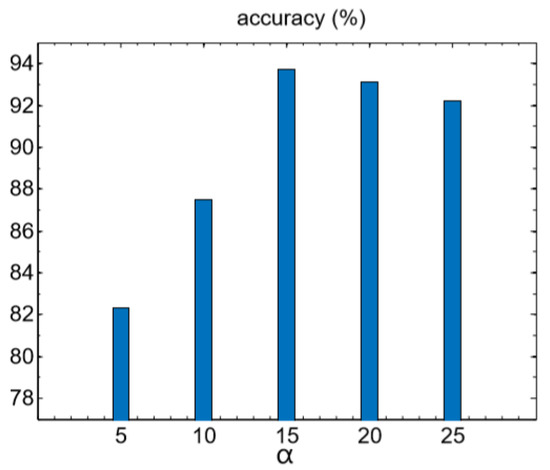 As indicated by the loss function in Equations (3) and (5), the parameter and would affect all combinations of the losses. controls the trade-off between optimization loss and softmax loss. For a wide-ranged values from 0.01 to 1, the model was robust to this parameter. Specially, when was set as 0, which means the model was trained using only softmax-CE loss, the performance was the worst. While controled the relative distance between the embedding to its corresponding center and to its nearest wrong center, it was more sensitive than . If it was too small, the optimization effect was weakened and it may cause over-fitting with a too-large value. Obviously, the best parameter selection was different in different datasets. An analysis was necessary to determine the best value of and . We tried different from 0.01 to 1 while observing the change of loss function at the same time. We found it had little effect on the performance of the final model. is fixed to be 0.1, and then set to be 5–25, respectively. As the Figure 5 shows, we set to be 15 in default for following experiments.