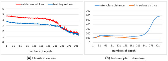 The convergent tendency of our proposed loss function with optimization method is shown in Figure 6a while Fbank was chosen as the basic input feature. It is observed that the classification model trained by optimized feature can converge normally. Figure 6b shows changes of the intra-class distance and the inter-class distance respectively, which means the optimization model had the ability to pull samples of the same class together as much as possible, and push samples of different class away. Thus, the classification model would be easier to use for distinguishing these embeddings.