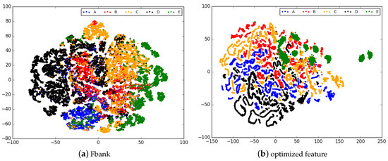 We adopt t-SNE [30] to visualize the optimized features of the samples from our test set. As is shown in Figure 7, compared with the Fbank, the learned embeddings using optimization method make clusters of the same class more compact and different ones more separated at the same time. This demonstrates that better underlying representations for classification task can be obtained using our proposed joint optimization loss.