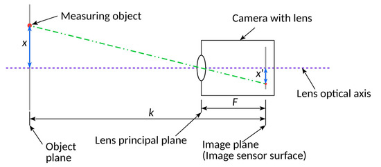 Scheme of the measurement stand (top view): k—distance between the object plane and the image plane (image sensor); F—distance between the plane of the optical centre of the lens and the image plane; x—displacement distance of the object measured in the horizontal axis in relation to the optical axis of the lens; x′—location of the image of the object measured in the horizontal axis.