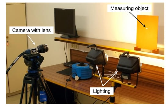 In addition to the camera, several lenses were used. The focal length of the lenses was selected according to need. In order to reduce the impact of lens distortion on the measurement results, only lenses with a high degree of correction were used, so that their distortions, especially the barrel and pincushion distortions, were negligible and did not have a significant impact on the measurement results. This is how the need to calibrate the camera, which is necessary in the presence of lens distortions, was avoided [51,52]. A colour image in RGB standard was recorded. Then, a red channel was extracted from it (due to the low colour temperature of the light source-incandescent light), resulting in a black and white image in grayscale. Next, the colour threshold procedure was performed, as a result of which a binary image was obtained. Then, the image was subjected to morphological transformations (erosion and dilatation), as well as to partial filtration, in order to remove small artefacts and objects whose position was not measured. The centre of mass was taken as the position of the object image on the image sensor. All the above-mentioned operations, i.e., recording, processing and image analysis, were carried out using the LabVIEW software [53].