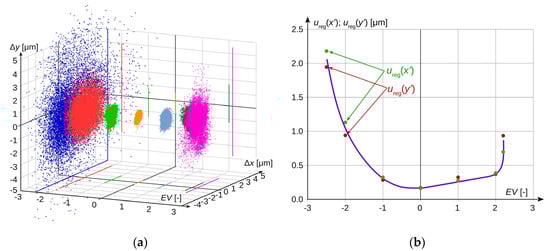 In order to estimate the effect of image recording parameters on the measurement uncertainty of the camera, registrations were made for various settings of the exposure time of the frame and the aperture value of the lens, while maintaining a constant value of sensor sensitivity. These changes translated into different levels of brightness of the recorded image. The registration was carried out starting from the settings characteristic for the optimal level of image brightness, toward its increase and decrease. Brightness level changes were determined in relative EV units in relation to the optimal level. The EV scale is logarithmic; i.e., each increase in the brightness level by +1 EV means that twice as much light as before the change was applied to the camera sensor. Naturally, changing the EV value can be achieved either by adjusting the exposure time and aperture value of lens or by changing both these parameters simultaneously. The obtained measurement results are presented in Figure 4a. To improve the readability of the drawing, the measurements made for individual lighting levels are shown in different colours.