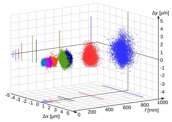 The measurement results show that the measurement uncertainty increases several times as the lens focal length increases with a constant scale of reproduction. In the considered case, this increase in the horizontal axis can be described by the following formula (result in [μm] for the focal length f given in [mm]):