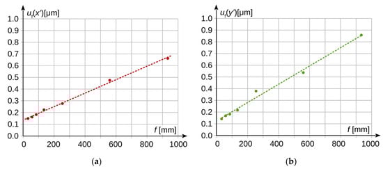 Standard measurement uncertainty as a function of lens focal length: (a) measurement results in the horizontal axis; (b) measurement results in the vertical axis.