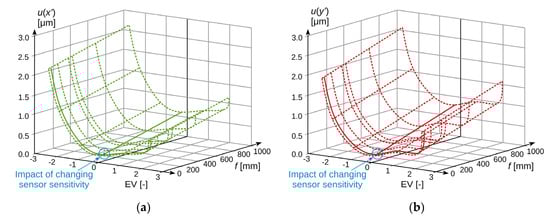 Based on the characteristics presented in Figure 6, it can be observed that the uncertainty value usns(x′) slightly increases, together with the increase of the image sensor sensitivity. For the analysed case, the increase in horizontal axis can be described by the following dependence (result in [μm]):