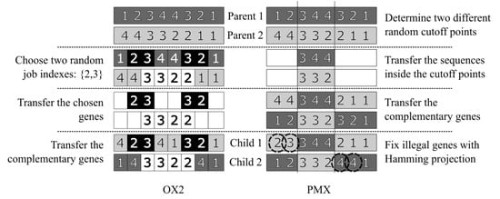 In this work, we will focus on two main crossover functions for conducting our assessments and evaluations: Partially Mapped Crossover (PMX) [66] and Order-based Crossover (OX2) [67]. These functions are two of the most widely used crossover functions in the specialized literature on JSSP solution by genetic algorithm. In this way, for our experiments, however, the same conclusions of our method can be obtained with any set .