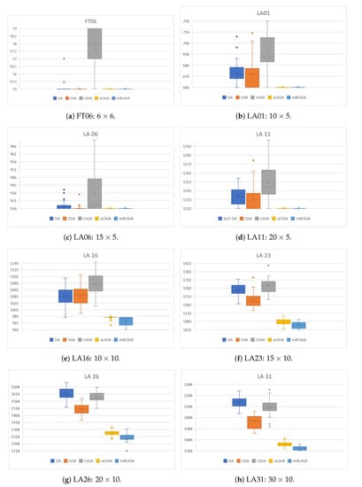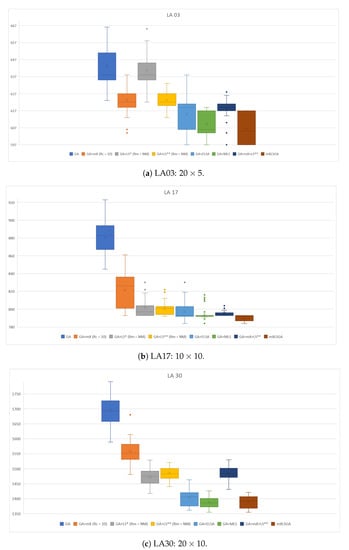 To visualize the statistical performance of each method, we made the box plots of the fitness values achieved in this case study, which are shown in Figure 6. As highlighted in the case study I (Section 5.2), box plots make it clear how the presence of a massive local search operator makes the method much more robust compared to the others, since in all the instances the aLSGA and mXLSGA methods are the most stable and have the best fitness values. This difference is even accentuated as the complexity of the instance increases. Also, the graphs reflect the values presented in Table 7, since mXLSGA is the box below the other boxes in all evaluations. We also noticed some details, such as why the mXLSGA standard deviation is the largest when executed in the LA 26 instance since this is because the technique finds the optimum value 6 times as a discrepancy. It is also clear from the graph that, statistically, our method is the method that most finds the best makespan settings.