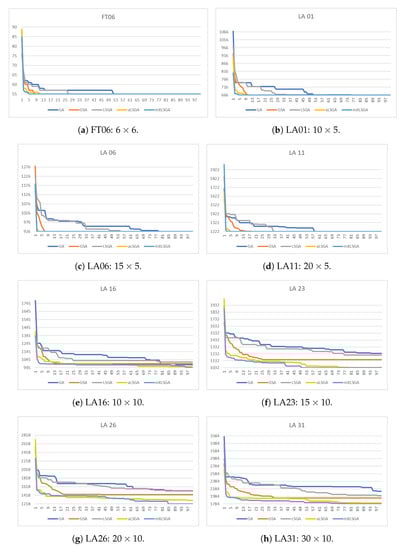 As shown in Table 7, it is noteworthy that mXLSGA found the optimal fitness value in all instances analyzed, and in instances FT 06, LA 01, LA 06 and LA 11, the proposed method found the optimal value in all executions. The mXLSGA presented the lowest worst value and the lowest average in all instances. In the instance LA 16, LA 23, and LA 26, mXLSGA did not obtain the lowest standard deviation value, however, it was the only method that found the optimal value in all these instances. Our method was the method that required the longest average execution time, but as it will be better explained in the following paragraphs, this is not in any way a deficiency in our method, as it does not need all 100 generations to converge.