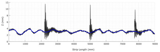 Figure 12a. Flatness information is highly corrupted by high frequency noisy vibrations from the cutting station and other mechanical effects on the steel sheet. Namely, the cutting station produces high amplitude/high frequency noisy waves on the metal strip every