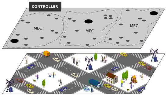 In this context, a given mobile node could increase its capabilities by using the available resources of MEC , while other entities lend their resources to MEC [44,45]. Therefore, MEC could provide services ( where m is the maximum of the number of services) up to mobile users at the network edge. Figure 1 shows the scenario in which the RELIABLE can be deployed in the controller node to manage the resources coming from the urban environment composed of mobile nodes connected through the 5G network infrastructure. The controller node is a centralized entity that has a global view of each MEC iteration and all users to allow better allocation.