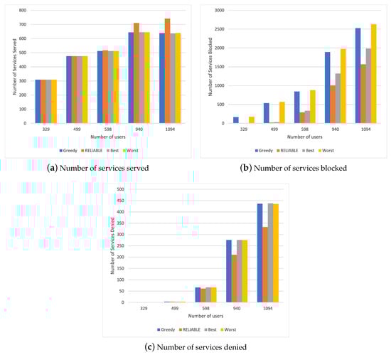 Analyzing the results obtained in Scenario 1 and Scenario 2, the behavior of RELIABLE was seen to be focused on attending to one type of service at a time. Thus, it is necessary to check whether this behavior is maintained in a scenario closer to real conditions, in which users could request one or more services at the same time, which requires more or fewer computational resources. Figure 4 shows the simulation results for different resource allocation mechanisms in a scenario with a different number of users requesting both security and entertainment services randomly. RELIABLE achieved a significant increase in the number of services served compared to other methods, as shown in Figure 4a. This is because network parameters regarding service execution are prioritized. Considering a number of users above 580, the Best, Worst and Greedy methods increased the number of services served compared to RELIABLE by 50%. It is possible to see an increase of 5% compared to Random, since it most often selected the MEC devices with sufficient resources to perform the service.