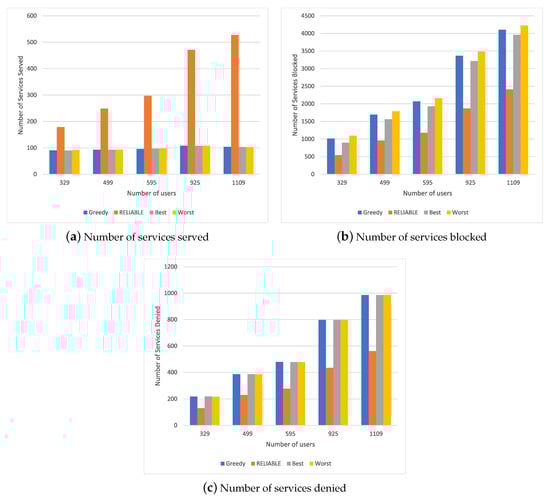 This amount of blocking had an impact on the number of denied services, where RELIABLE obtained a reduction of 2% compared to the other methods, as shown in Figure 2c. When we analyzed a smaller number of requests, we were able to observe that all services were provided with 329 users requesting services, and a very similar services denied number was found 499; this was due to the number of resources available by the set of MEC devices. In this way, when considering the request for only a single service, we can see that RELIABLE can handle a greater number of requests, with a low service blocked number and resource use compared to a scenario with a higher number of requests.