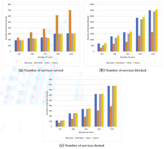The number of services denied due to a lack of pool resources and Cloud MEC devices can be seen in Figure 4c. When the Best, Worst and Greedy methods are compared to RELIABLE, a reduction close to 39% can be observed. In the case of comparison with Random, the reduction is 3% as the proposed policy has a better load balancing behavior between resources within the MEC; i.e., the Best, Worst and Greedy methods allow the allocation of the available resources in a disorderly manner.