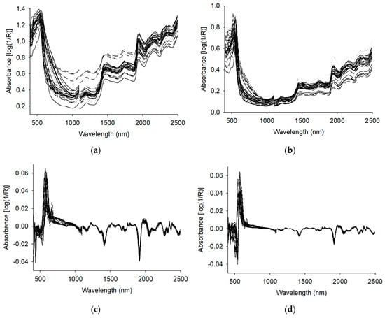 The visible/near-infrared full-wavelength spectra: (a) raw spectra of tea leaves, (b) raw spectra of tea powders, (c) first derivative spectra of tea leaves, and (d) first derivative spectra of tea powders.