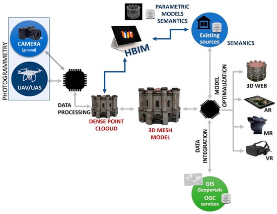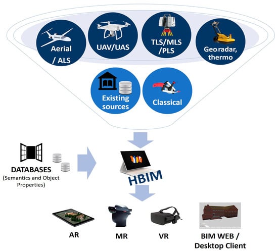 An unprecedented progress of technologies caused the emergence of many new measurement platforms and sensors. They are able to quickly obtain comprehensive data on historic buildings. They allow us to increase the speed of data acquisition, improve the level of detail and spatial resolution. The development of measurement technologies has also increased the amount of collected data, added new attributes, and additional parameters describing material properties. A comprehensive review of the measurement methods used for the geometric documentation of cultural heritage was presented by Georgopoulos [37]. A typical methodology for implementation of an HBIM is shown in Figure 1.