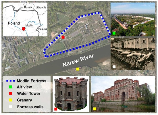 The Modlin fortress is one of the largest 19th century fortresses in Poland. The fortress is located on the territory of Nowy Dwór Mazowiecki, at the fork of the Vistula, Narew and Wkra rivers (Figure 3). It is situated 34 km north-west of the Polish capital, Warsaw. It consists of a citadel on the right bank of the Narew River, fortified forecourts—Kazunski and Nowy Dwór—and two rings of forts. The fortress was initially built by the French in the years 1806–1812. The main barrack located within the complex is the longest building in Europe, with a length of 2250 m. It can accommodate up to 20,000 soldiers.