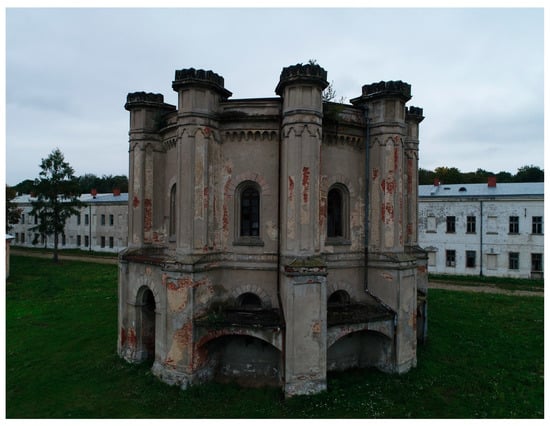 Inside the barracks, the courtyard features a beautifully designed neo-Gothic water tower (Figure 4). The water tower was built around 1847 on a circle plan (octagon). A huge water reservoir placed on the first floor supplied the barracks with water. The water was drawn by means of spouts placed outside the building (in special, roofed recesses). Each was placed in the open mouth of a lion. In the walls of the recesses, there were stone troughs for watering horses. The water tower was used in the interwar period (until 1939) for watering horses.