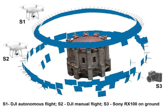 In the third stage, images have been acquired from ground around the building using an RX100 II camera (Sony, Tokyo, Japan). This camera is an element of the UAS fixed-wing equipment, which is mainly used for mapping larger areas [21]. The technical parameters of the DJI and Sony cameras are shown in Table 2.