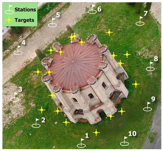 The TLS data was collected through a time-of-flight laser scanner (ScanStation C10, Leica Geosystems, Heerbrugg, Switzerland). Ten stations were used during field data collection (Figure 6). The technical parameters of Leica ScanStation C10 are presented in Table 3. Nineteen target spheres were evenly distributed around the building before scanning, and point clouds acquired from different stations were registered into the same coordinate system based on these target spheres.